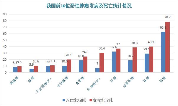 以下为我国前10位恶性肿瘤发病及死亡统计图: