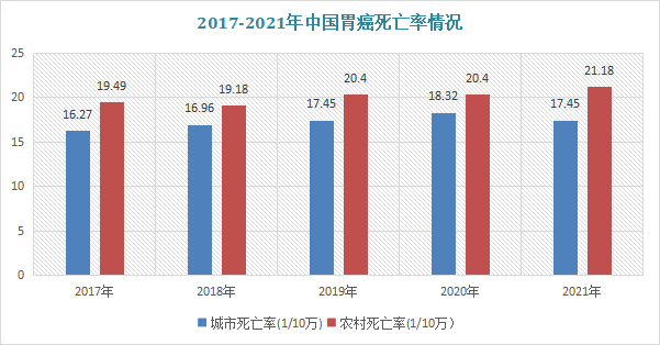 在全球185个国家或地区中,中国部分消化道肿瘤如食管癌、胃癌等恶性肿瘤的发病和死亡约占全球的一半。根据国家癌症中心数据,2018年全国新发恶性肿瘤约392.9万例,恶性肿瘤死亡例数约233.8万例,新发病例和死亡病例分别占全球的23.7%和30.2%;2021年城市胃癌死亡率为0.17%,农村胃癌死亡率0.21%。
