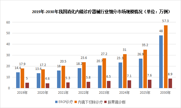 以下为2019年-2030年我国消化内镜诊疗器械行业细分市场规模图: